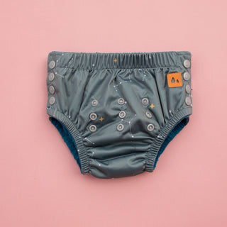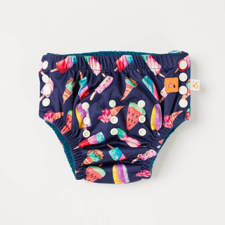 Reusable swim diaper for kids 10-45 lbs. Snug fit, solid containment, adorable prints, and durable snaps for comfy, secure, and stylish water adventures
