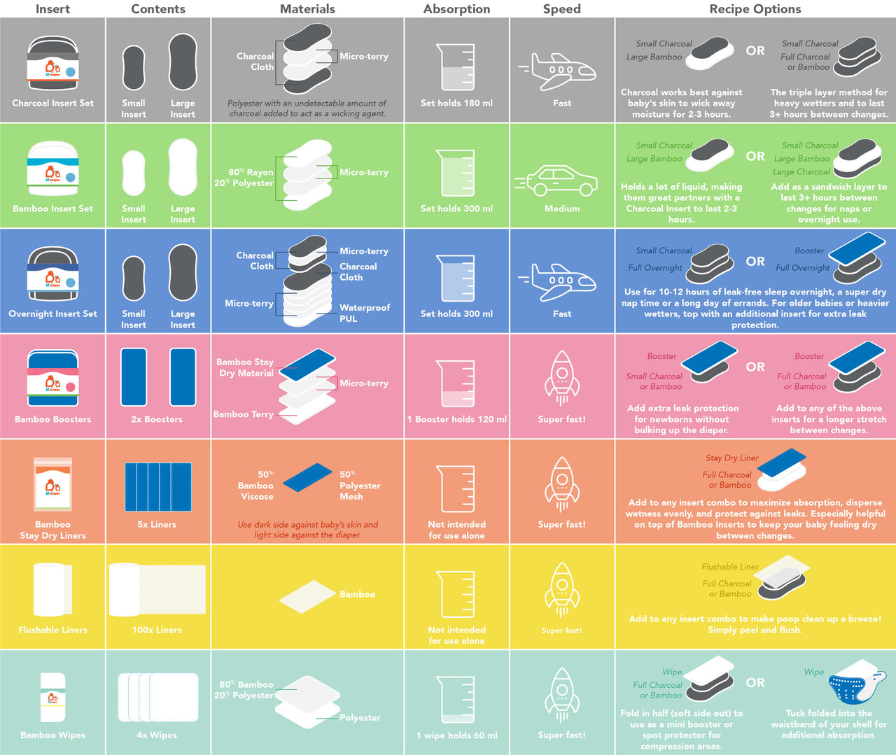 Made from a blend of 50% bamboo viscose and 50% wicking polyester mesh, these liners are soft, breathable, and gentle on delicate skin. Bamboo’s natural deodorizing, antibacterial, and hypoallergenic properties keep things fresh while wicking moisture away to keep your little one comfy and dry.