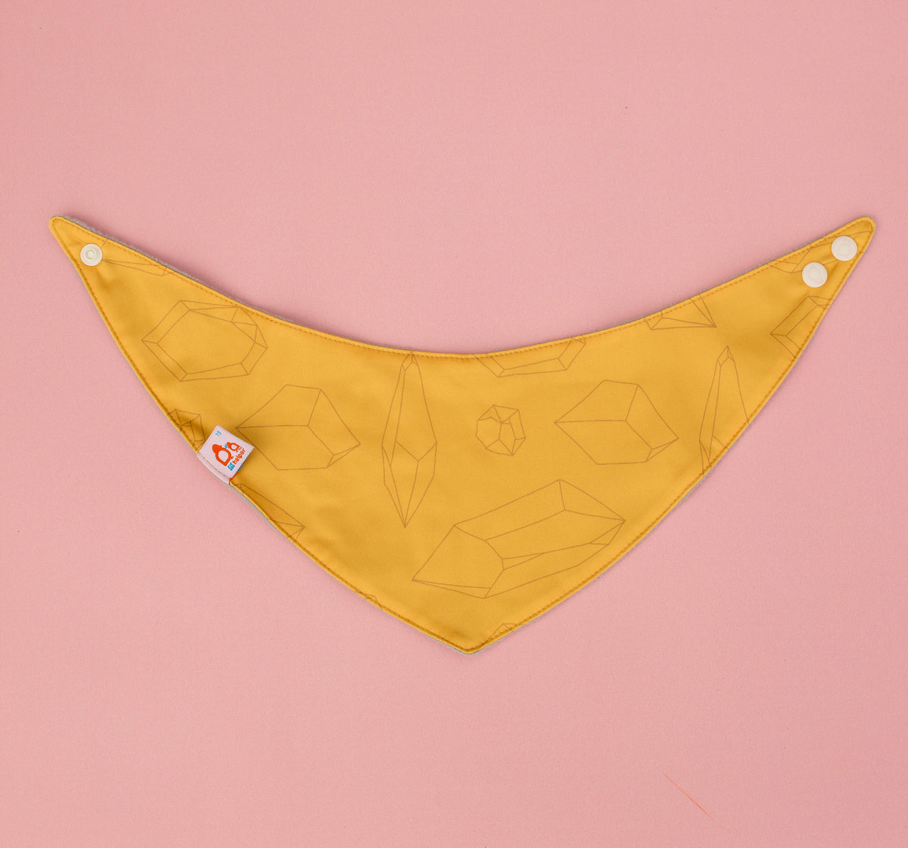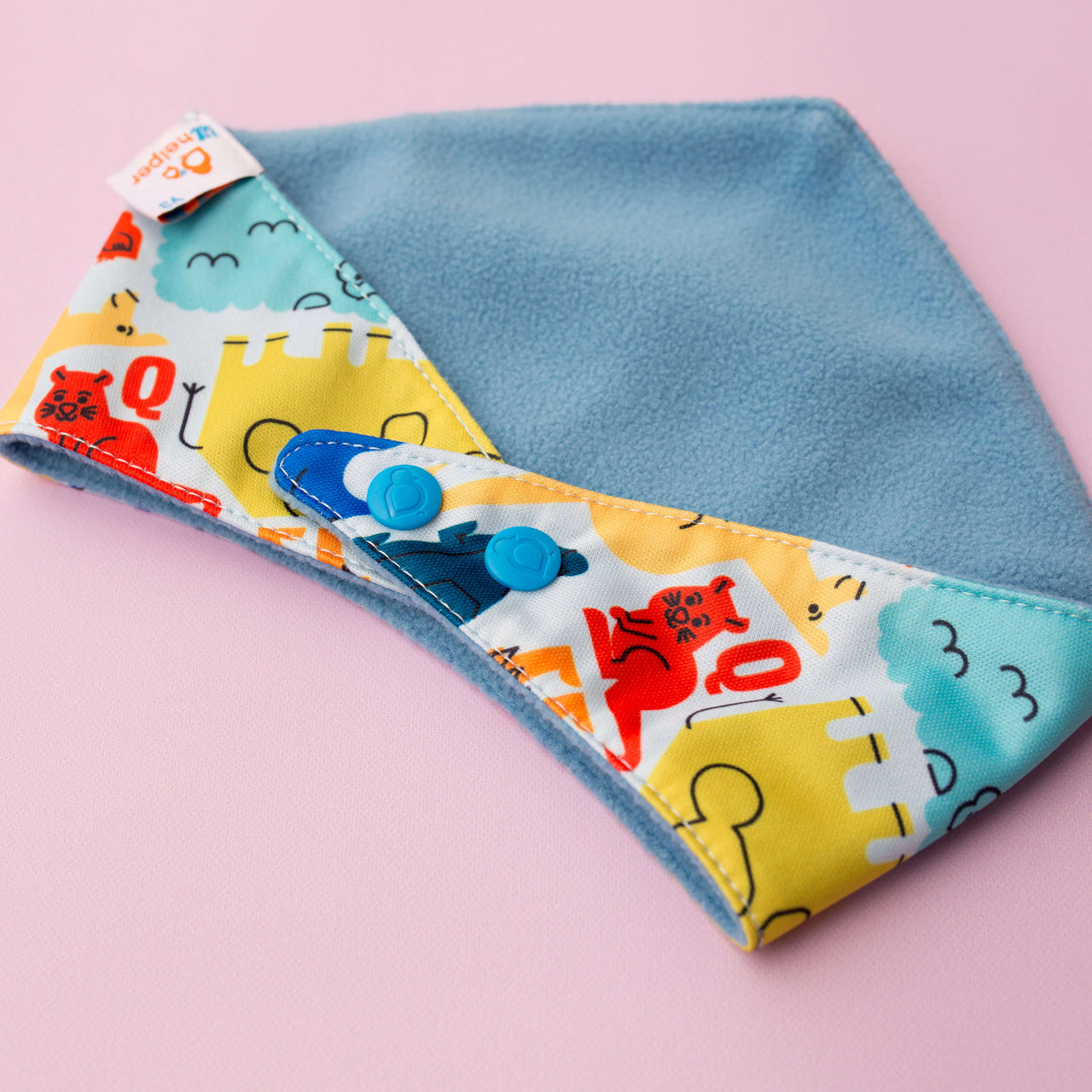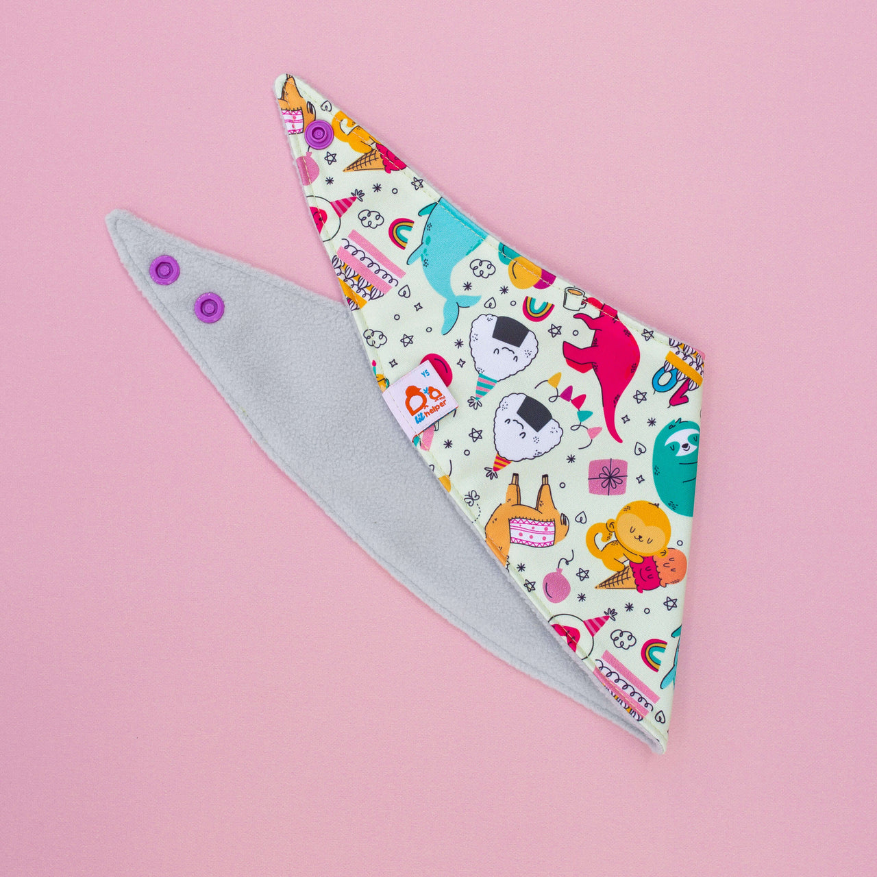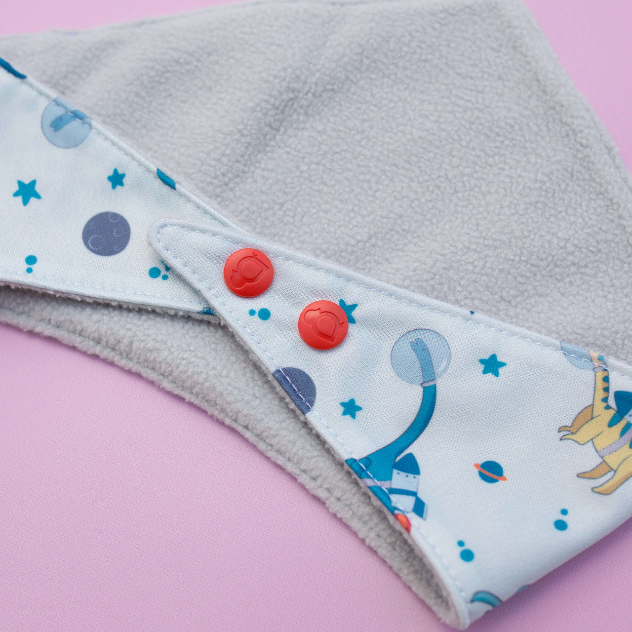 Soft fleece on one side for drool, waterproof PUL on the other for messes. Flip it, wipe it, repeat—two bibs in one stylish package.