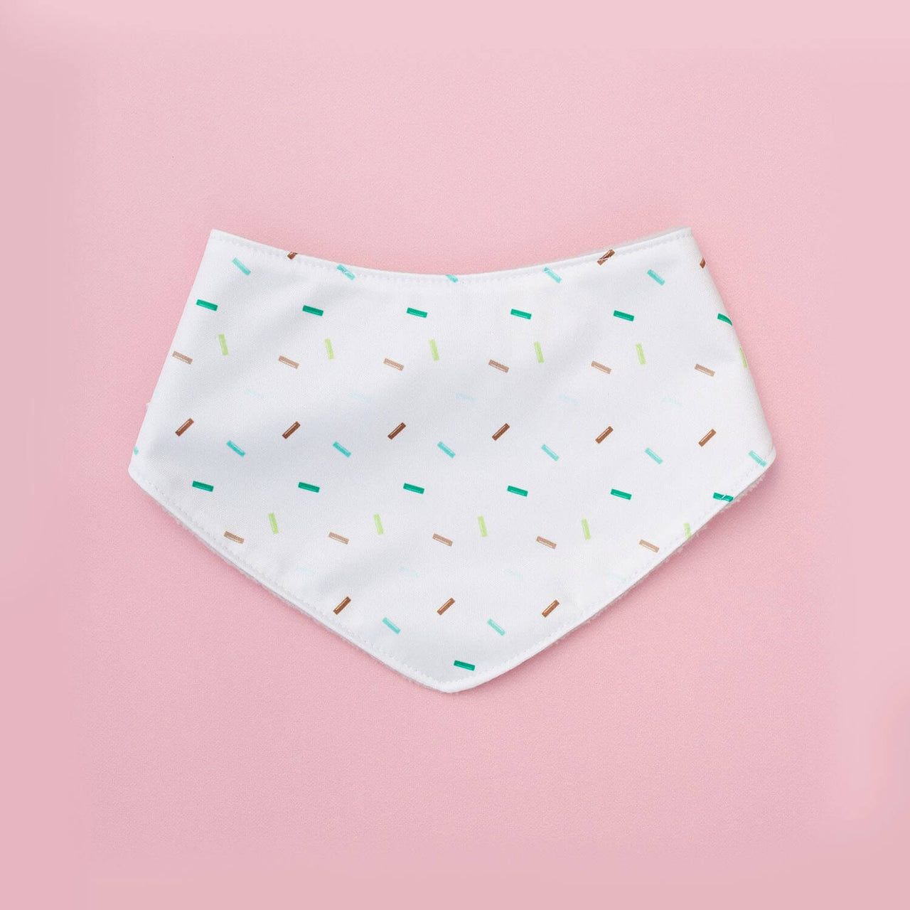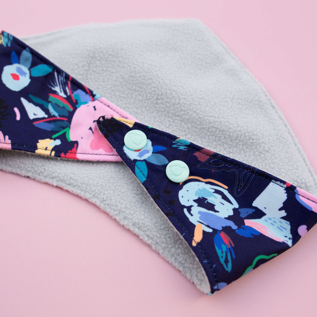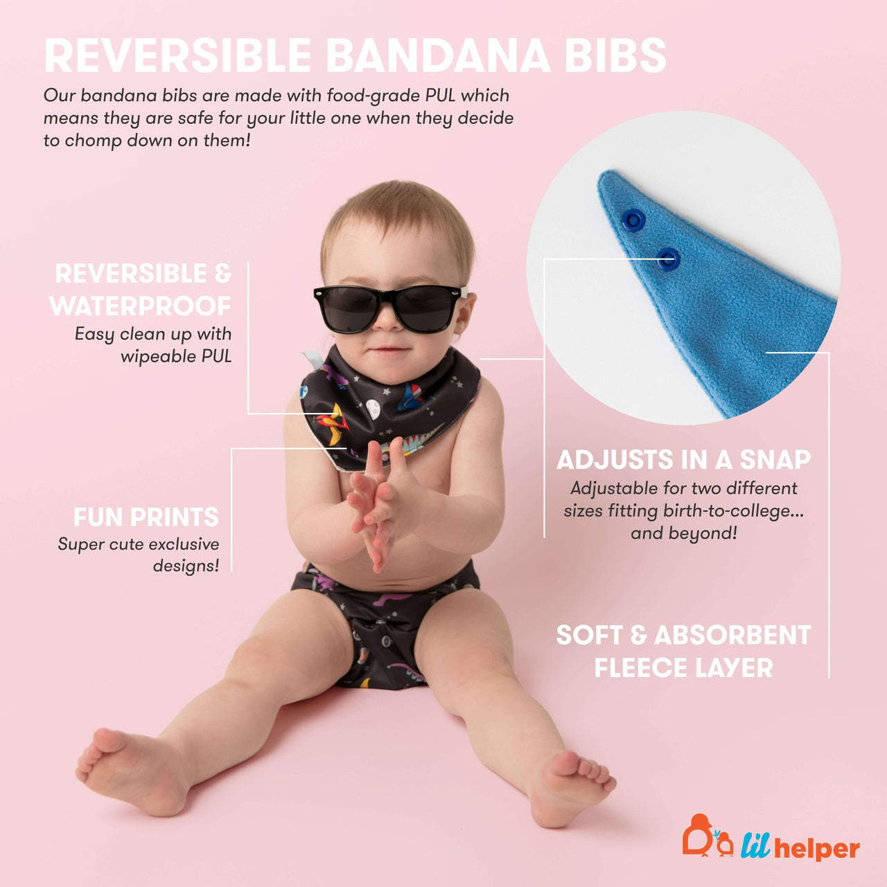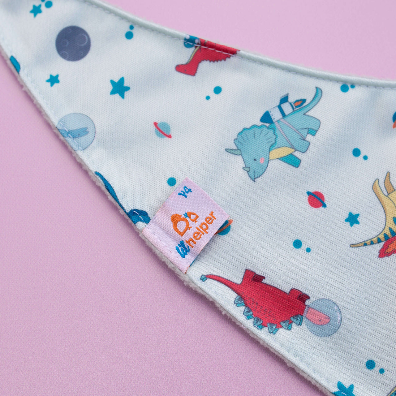 Soft fleece on one side for drool, waterproof PUL on the other for messes. Flip it, wipe it, repeat—two bibs in one stylish package.