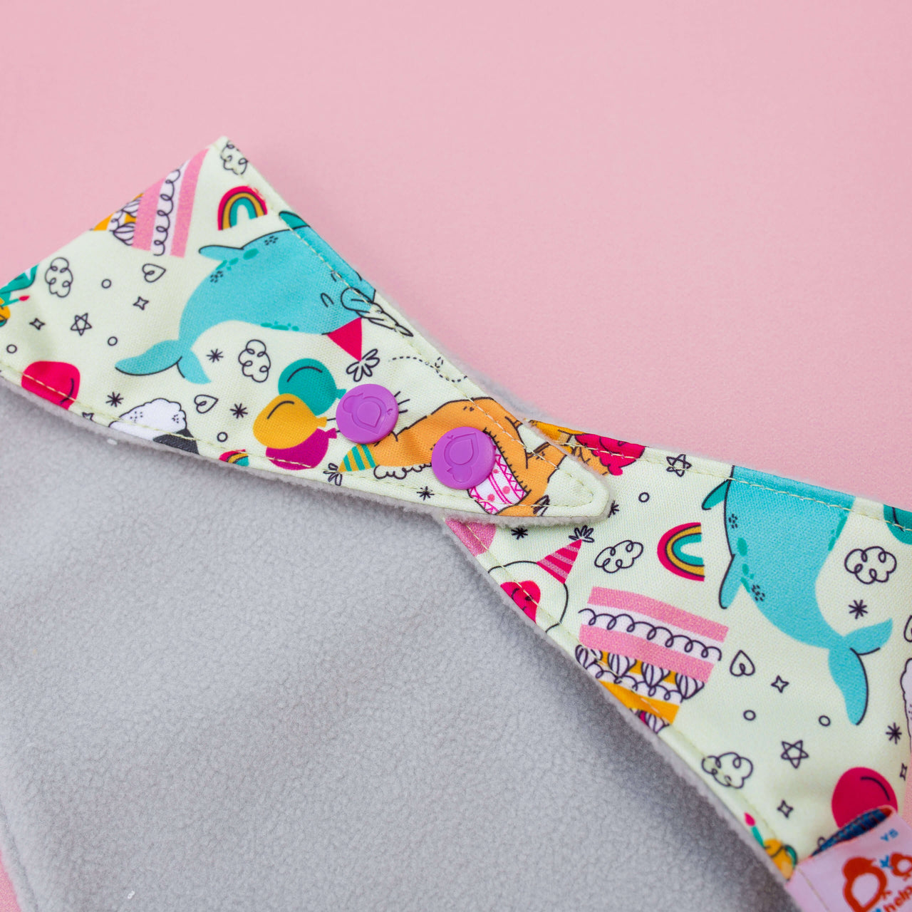 Why settle for one bib when you can have two in one? The fleece side soaks up drool and spit-up to keep skin dry and comfy, while the waterproof PUL side wipes clean after mealtime messes. Reversible, reusable, and ridiculously handy, this bib saves laundry, time, and your sanity. Perfect for drooly days, snack attacks, and everything in between.