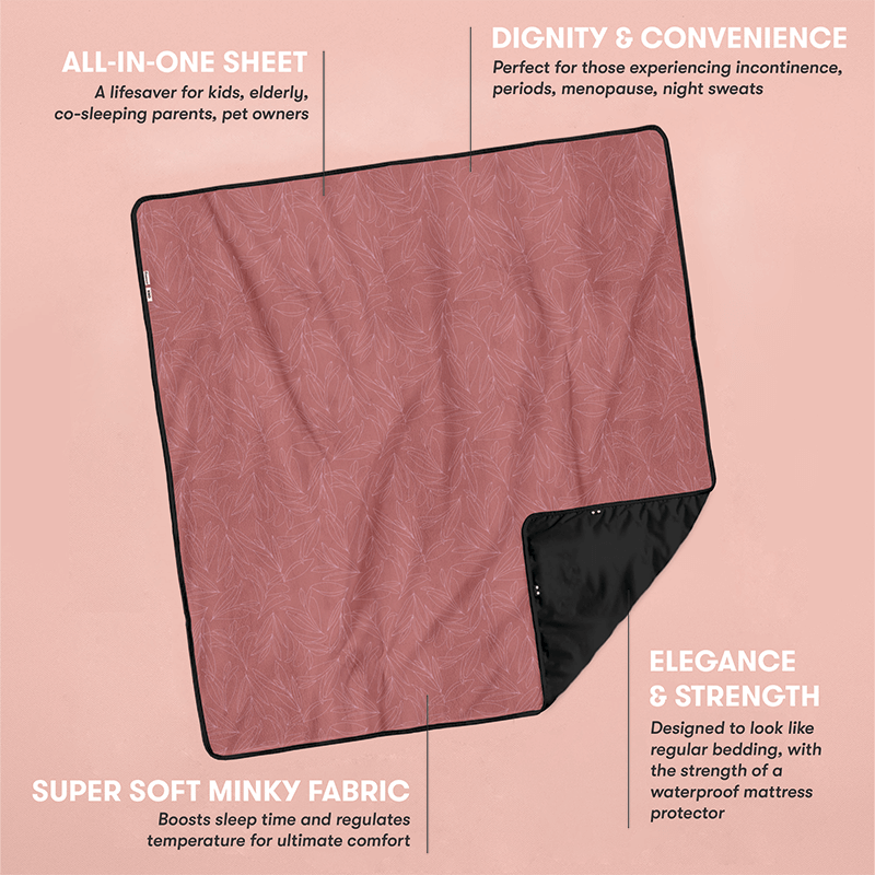 A luxuriously soft, reusable waterproof blanket with absorbent layers, ideal for periods, intimacy, senior care, nighttime security, and everyday comfort.
