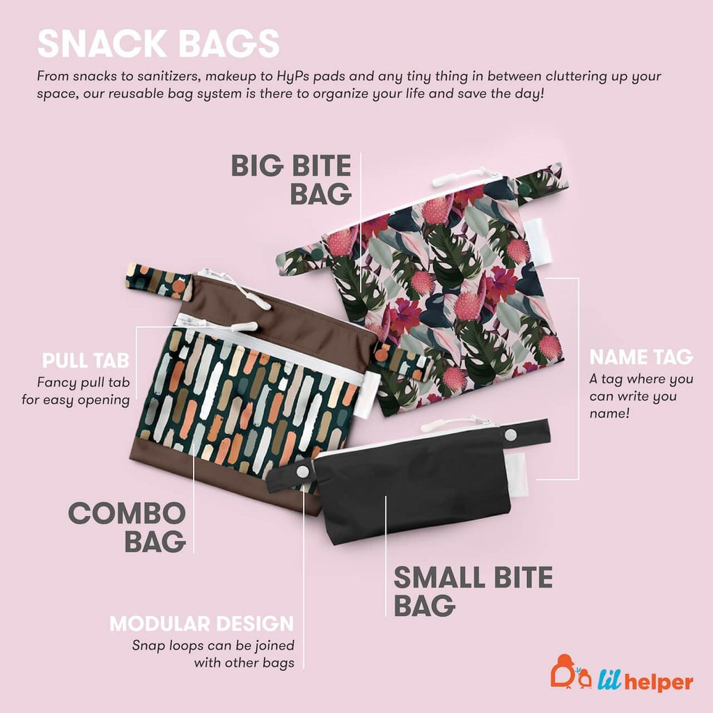 The Small Bite and Big Bite bags keep essentials secure and mess-free. The Small Bite is perfect for quick grabs, while the Big Bite offers extra space for larger snacks, meals, or on-the-go storage.